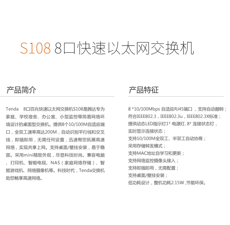 腾达/Tenda S108 交换机 8口百兆交换机 8口交换机